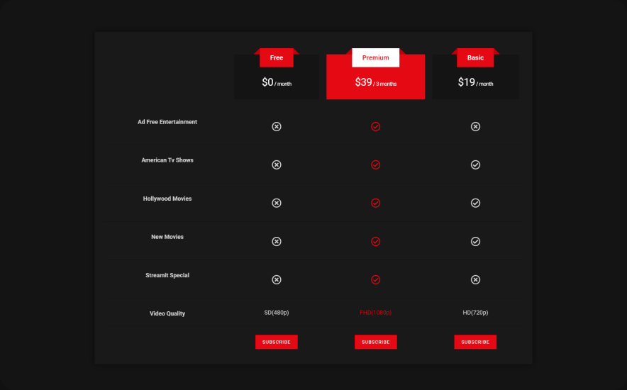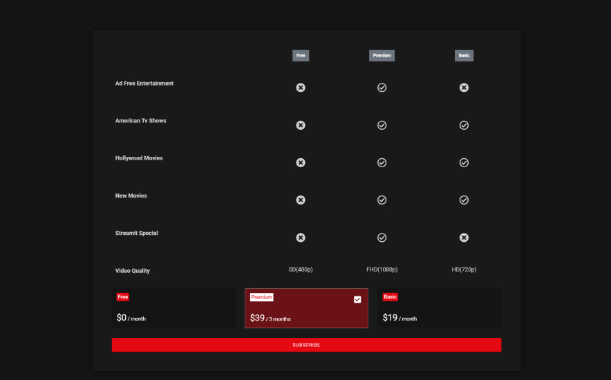 Pricing PlansStreamit comes with a built-in Subscription Widget for easily setting up online streaming with subscription-based pricing plans.